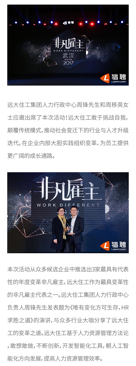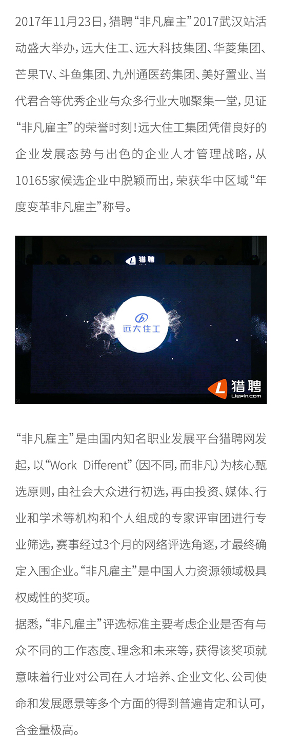 遠(yuǎn)大住工榮膺2017華中區(qū)域“年度變革非凡雇主”