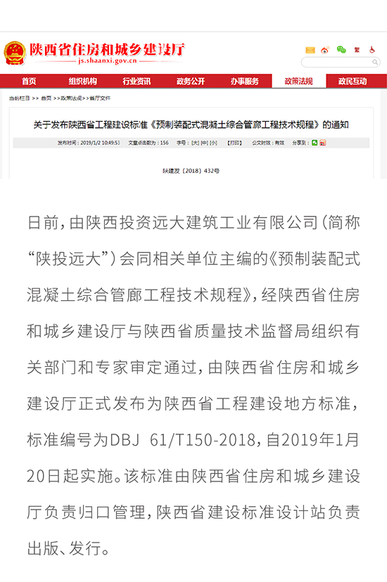 陜投遠大主編《預制裝配式混凝土綜合管廊工程技術規(guī)程》 由陜西省住建廳發(fā)布實施
