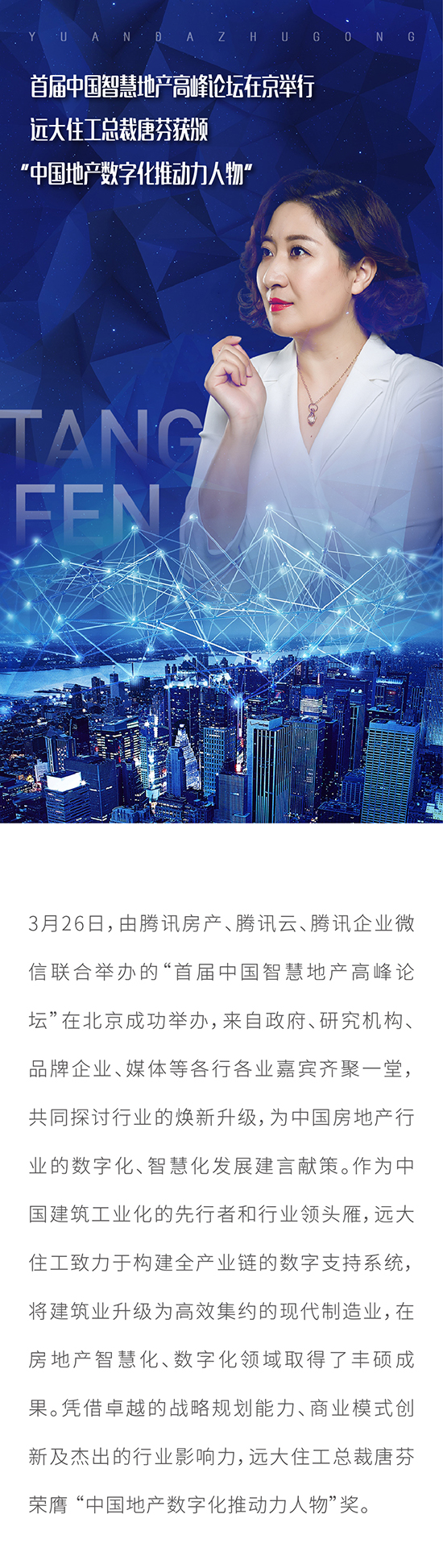首屆中國(guó)智慧地產(chǎn)高峰論壇在京舉行 遠(yuǎn)大住工總裁唐芬獲頒“中國(guó)地產(chǎn)數(shù)字化推動(dòng)力人物”