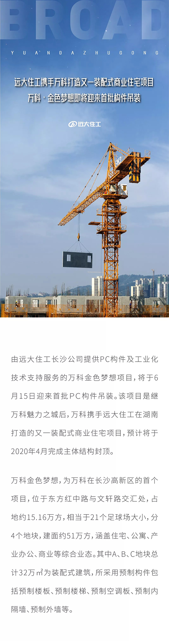 遠大住工攜手萬科打造又一裝配式商業(yè)住宅項目 萬科·金色夢想即將迎來首批構件吊裝